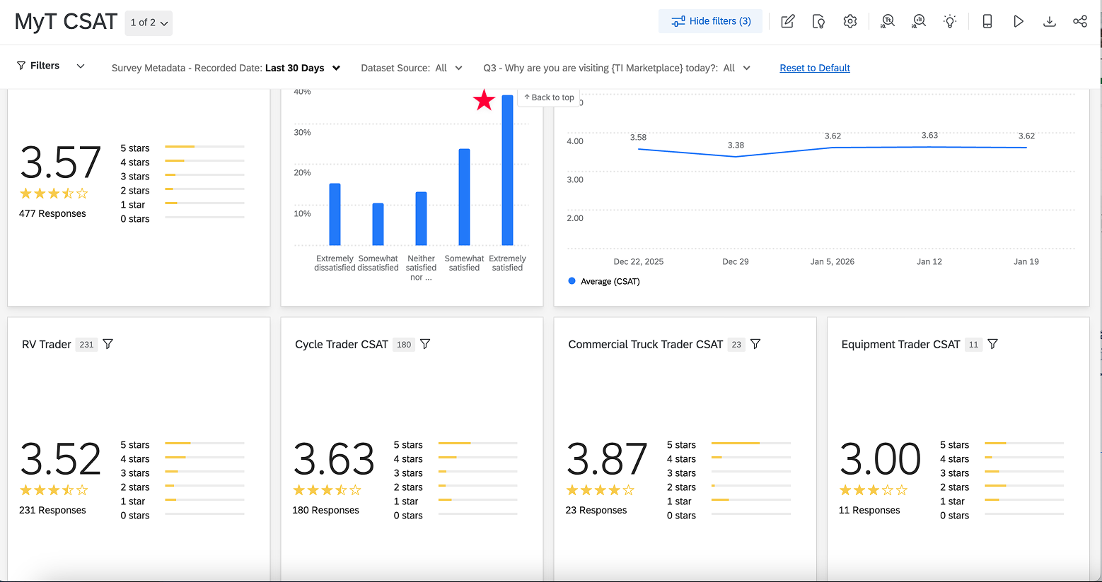 We began by analyzing CSAT scores and open-ended customer comments to uncover recurring pain points. This helped us identify where users were struggling most and which issues had the greatest impact on satisfaction. Common themes included confusion around account management, difficulty completing key tasks, and inconsistent experiences across different Trader platforms.